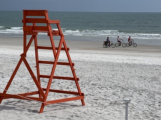 We have stayed very close to the water, usually riding within sight of it. Most often there is just a single row of properties on our right (if any!). We stop periodically and pop out onto the beaches to see what’s happening. The beaches are all accessible, except for ones with high dollar properties or chain hotels. Parking lots are plentiful too. The beaches haven’t been crowded at all. There are ‘sun bathers’, beach combers and fishermen as well as an occasional biker (on a fat bike!).